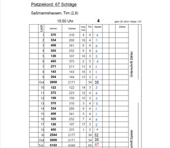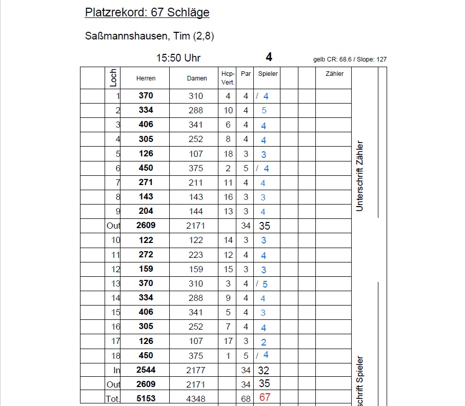 Kleine Korrektur zum vorher eingestellten Artikel: Am 30.4. hat Tim Saßmannshausen in einer 'RPR-Runde' keinen 'neuen' Platzrekord aufgestellt, sondern ihn eingestellt (siehe Scorekarte Darren Hillier aus 2016) mit einer 67 auf dem Par 68-Kurs. Glückwunsch!