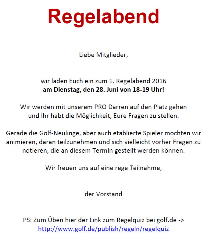 Di, 28.06.: Damen-Nachmittag um 15 (!) Uhr + Regelabend ab 18 Uhr!!