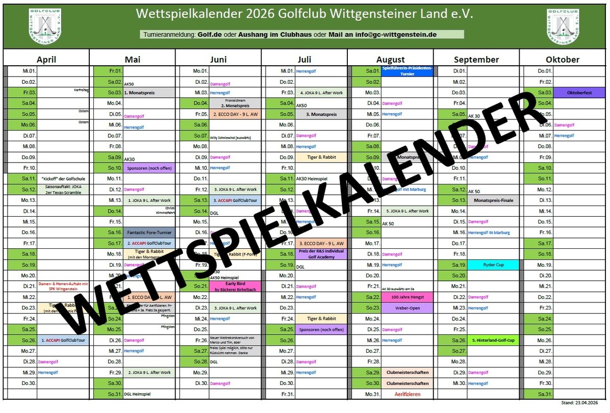 So: 1. ACCAPI GolfClubTour- Turnier! Deutschlandweite Serie - hier hat der Hauptsponsor gewechselt zu dem italienischen Sportswear-Hersteller ACCAPI (www.accapi.com). Dies ist eine Turnierserie mit 3 Turnieren (26.4., 17.5., 13.6.) und Gesamtwertungen in 5 Klassen (Brutto Damen und Herren plus 3 Nettoklassen) und entsprechend vielen Preisen auch bei jedem einzelnen Turnier. Normalstart Sonntag ab 10 Uhr, Meldeschluss ist Samstag, 12 Uhr. Nicht-Teilnehmer: Von Bahn 1 kann bis 9 Uhr und ab ca. 15 Uhr ganz normal gestartet werden.Schöner sparen: GolfPost-Kalender 2026!